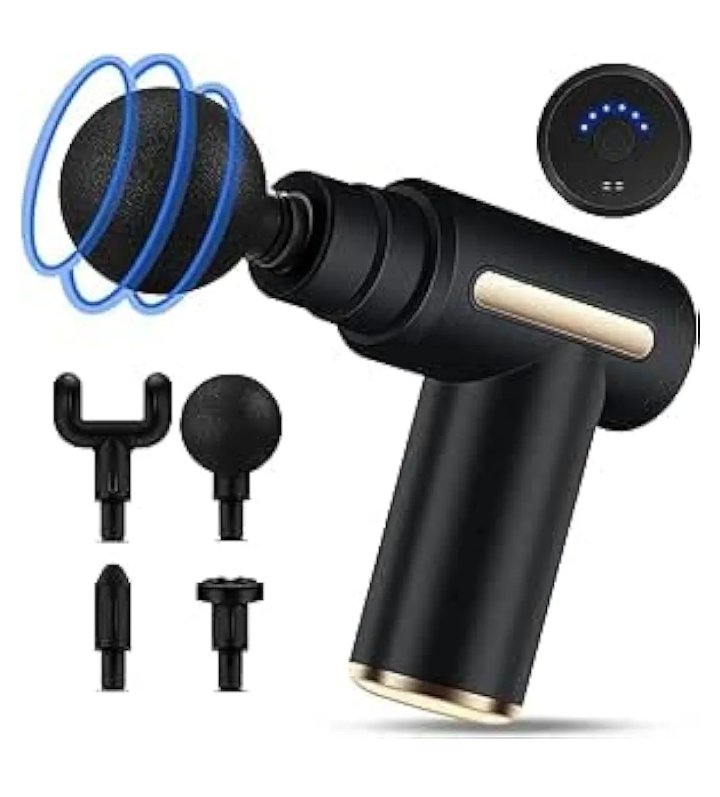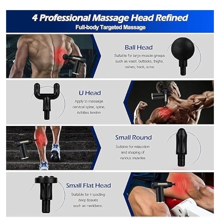Muscle Massage GunThere are 6 vibration modes to relieve muscle pain Intelligent type automatic pressurization Wireless compact. Equipped with 4 types of interchangeable massage heads.